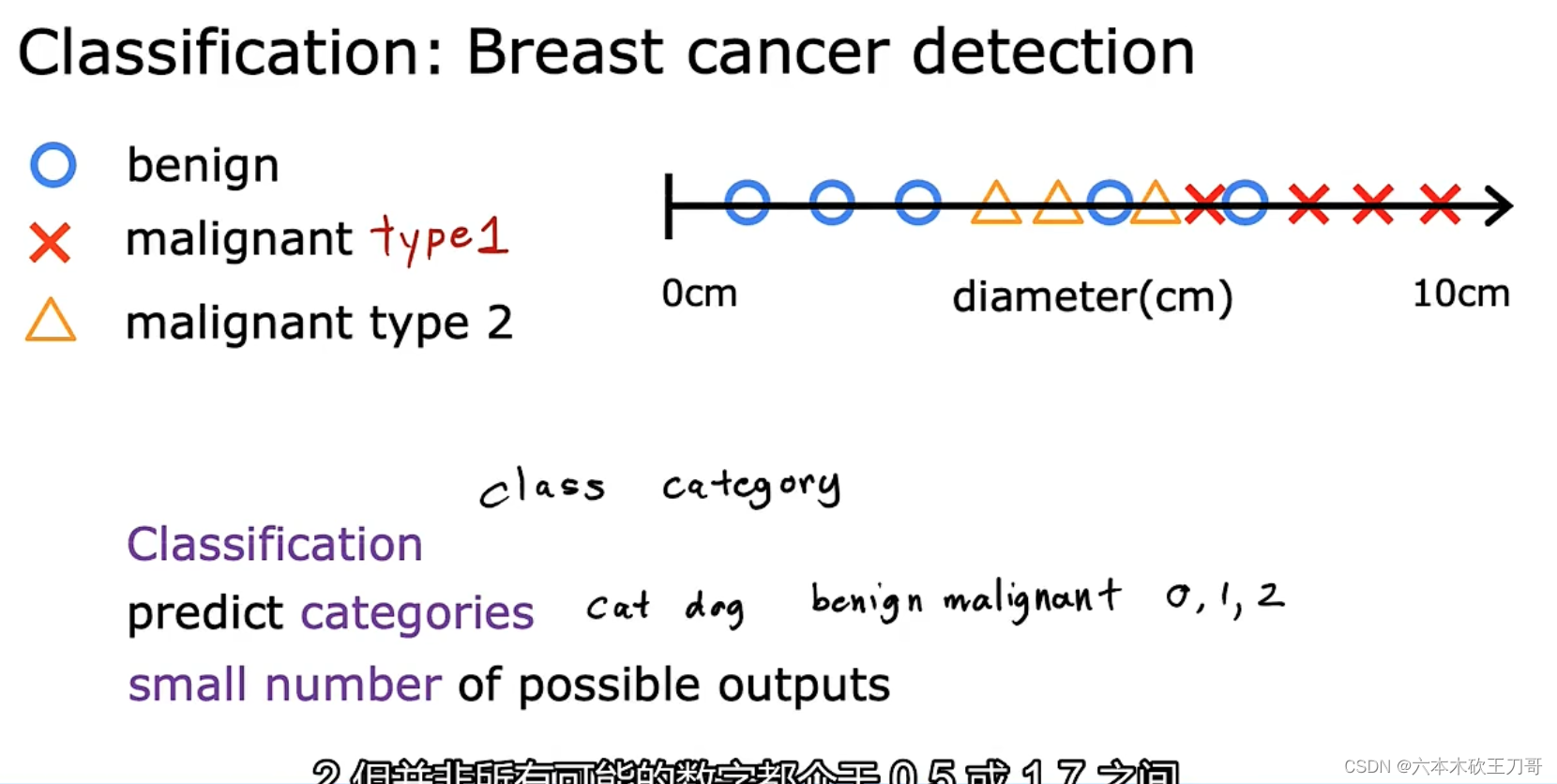 分类指的是,我们试着推测出离散的输出值:0 或 1 良性或恶性,而事实上在分类问题 中,输出可能不止两个值。比如说可能有三种乳腺癌,所以你希望预测离散输出 0、1、2、 3。0 代表良性,1 表示第 1 类乳腺癌,2 表示第 2 类癌症,3 表示第 3 类,但这也是分类问 题。