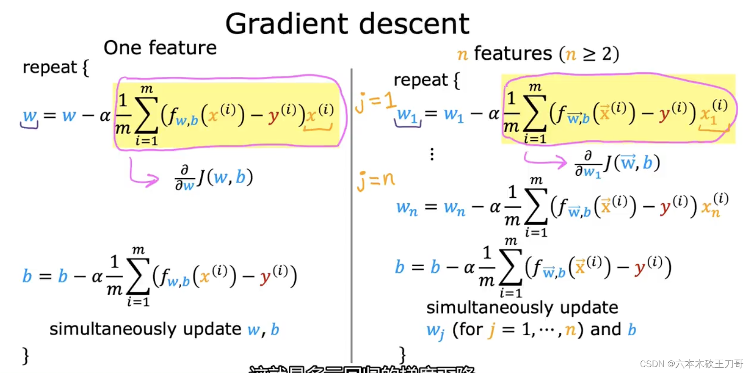 其中𝑎是学习率(learning rate),它决定了我们沿着能让代价函数下降程度最大的方向向下迈出的步子有多大,在批量梯度下降中,我们每一次都同时让所有的参数减去学习速率乘以代价函数的导数。