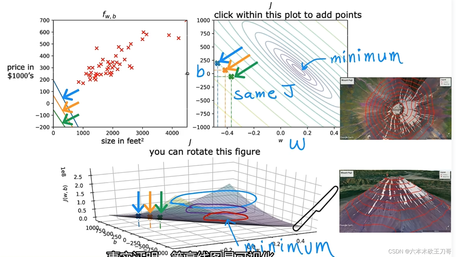 现在来看几个例子,帮助更好的理解单变量线性函数和它的代价函数之间的关系,分别取不同的w和b,对应等高线图中的不同位置,越靠近中心点,拟合的效果越好。