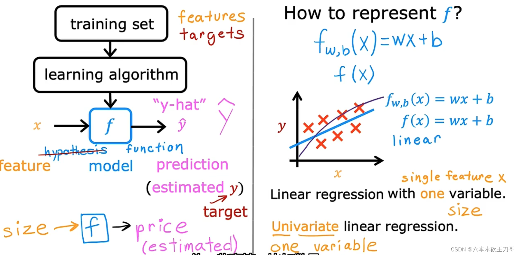 训练算法在这里是一个函数f,输入feature x,输出估计值y-hat,y-hat并不一定等于真实值。在线性回归中,f是用wx+b表示的,因为只含有一个特征/输入变量,因此这样的问题叫作单变量线性回归问题。