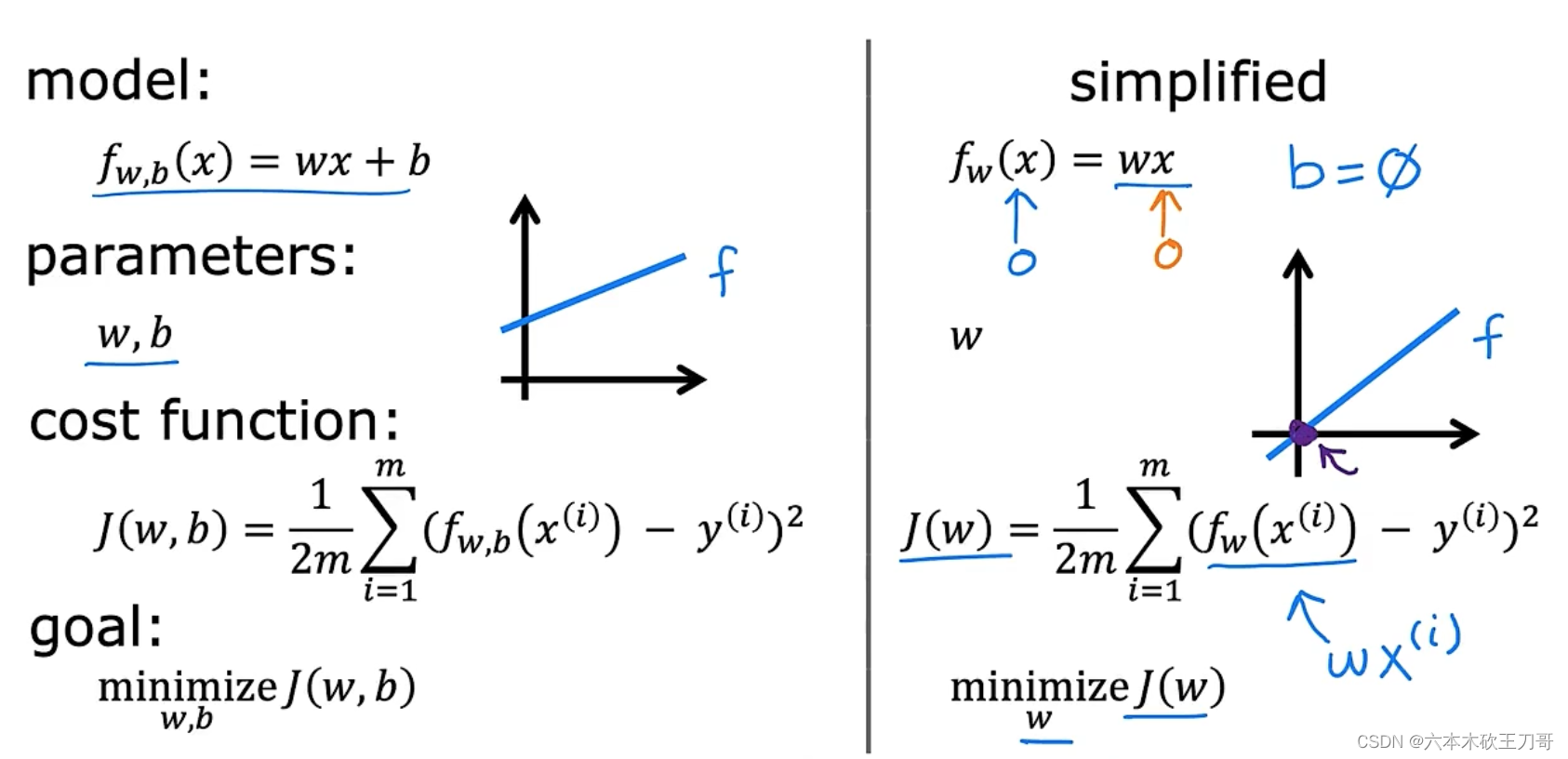 我们给了代价函数一个数学上的定义。在这个视频里,让我们通过一些例子来获取一些直观的感受,看看代价函数到底是在干什么。 首先需要明确目标是最小化代价函数,并找出最小化代价函数的参数(单变量线性回归中是w和b)。