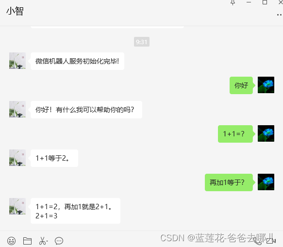 然后我们启动项目,微信扫码登录后,管理员会立即收到机器人发的消息(前提是已经加过机器人为好友,并且昵称为config.wechat.manageName中设置的内容)。然后就可以连续对话了。