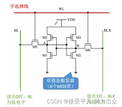 读出:WMOS管:可理解为一种电控开关,输入电压达到某个阈值时,MOS管就可以接通,MOS就是一个典型的半导体元件;电容的下面是接地的,当电容上下存在明显电压差,就会产生电浮,计算机中用二进制1表示,MOS管中电压达到某个阈值时,就会接通,将1传入到另一边