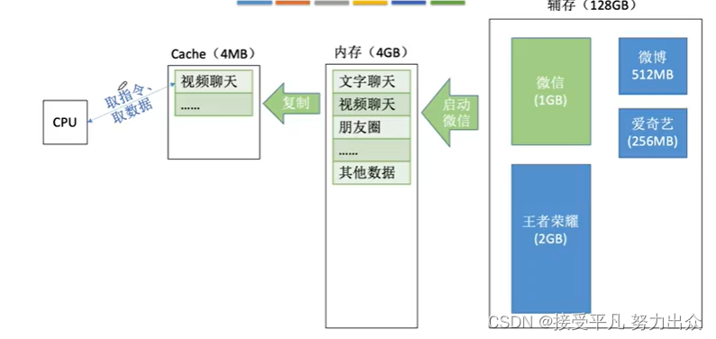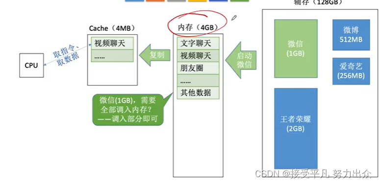 我们平时玩的王者荣耀,抖音是放在辅存里面的,但是要是运行需要把辅存中的数据调入到CPU,而辅存的速度又太慢,只能先将其调入到主存,然后再被CPU访问。
