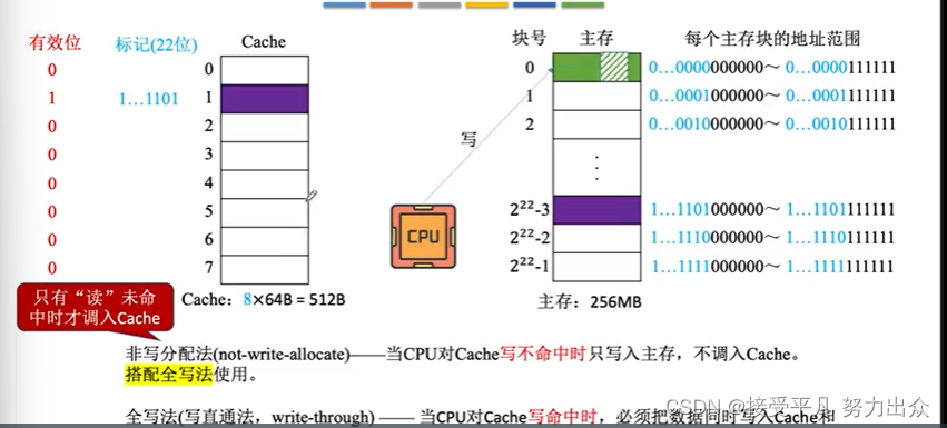 写分配法--当CPU对Cache写不命中时,把主存中的块调入Cache,在Cache中修改。通常搭配写回法使用