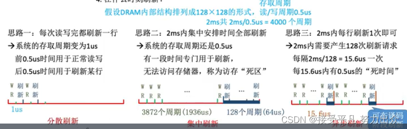 3.如何刷新:有硬件支持,读出一行的信息后重新写入,占用1个读/写周期