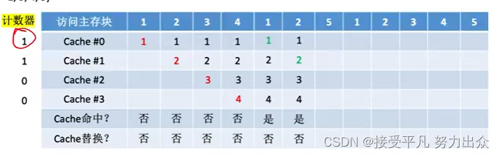 3.未命中且无空闲行时,计数值最大的行的信息块被淘汰,新装行的块的计数器置为0,其余全加1
