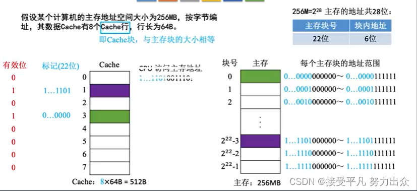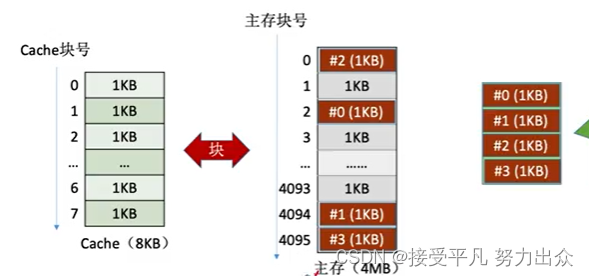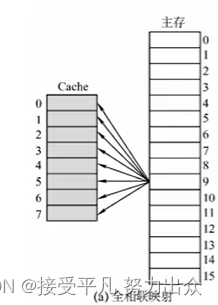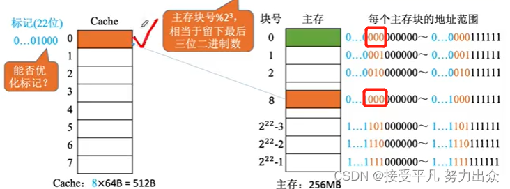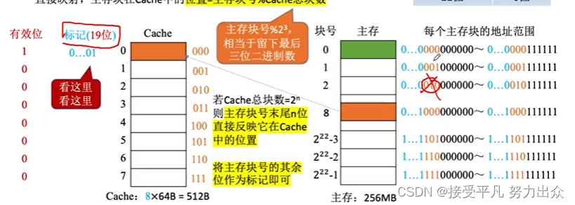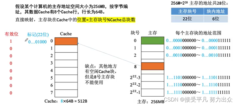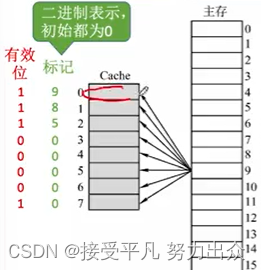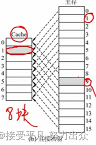 例如主存中块号为0的0%8=0存储在Cache0的位置,主存中块号8,8%8=0,也是存储在0的位置,
