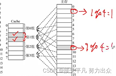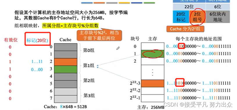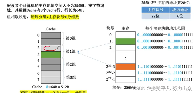 组相联映射--Cache块分为若干组,每个主存块可放到特定分组中的任意一个位置组号=主存块号%分组数