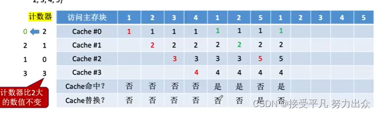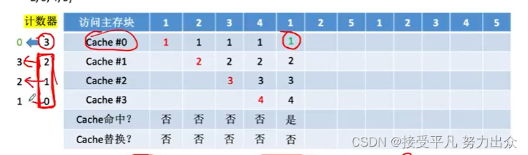 1.命中时,所命中的行的计数器清零,比其低的计数器加1,其余不变