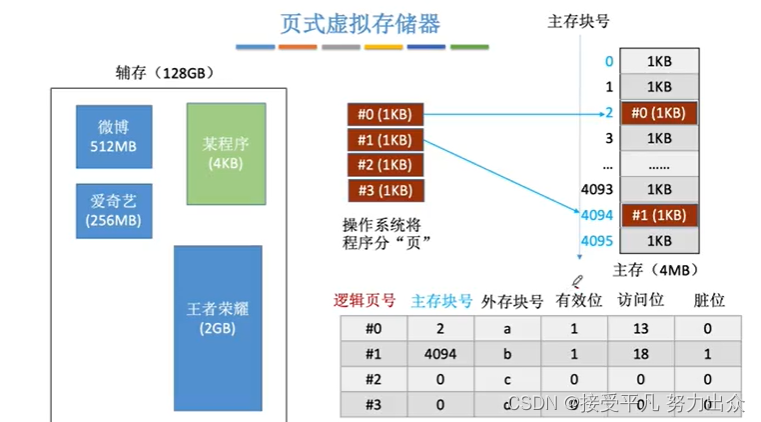 假如一个微信有1GB大小,全部放入内存,并且需要连续存放,在很多时候会导致主存的利用率不高;为了让主存的利用率更高,就拿某个程序(4KB)来说,我们会把4KB的程序分为4个"页",每个页面的大小相同