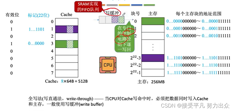全写法--当CPU对Cache写命中时,必须把数据同时写入Cache和主存,一般使用写缓冲