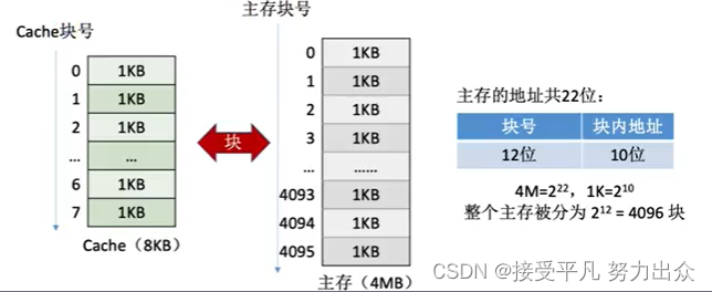 将主存的存储空间"分块',如:每1KB为一块,主存与Cache之间以"快"为单位进行数据交换