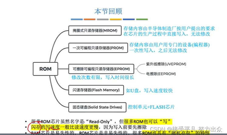 类型特点 SRAM(静态RAM) DRAM(动态RAM) 存储信息 触发器 电容 破坏性读出 非 是 读出后需要重写? 不用 需要 运行速度 快 慢 集成度 低 高 发热量 大 小 存储成本 高 低 易失/非易失性存储器? 易失 易失(断电后信息消失) 需要刷新? 不需要 需要(分散,集中,异步)