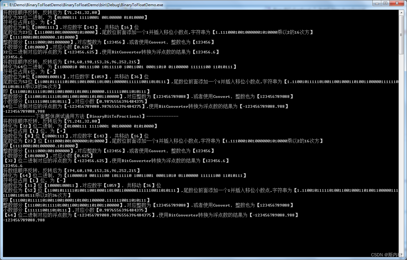 Console.WriteLine($"【{totalBitCount}】位二进制对应的浮点数为【{destNumber}】,使用BitConverter转换为浮点数的结果为【{BitConverter.ToSingle(binaryArraySource, 0)}】");