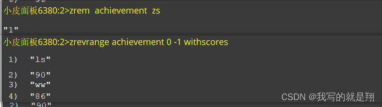 redis > ZADD mid_test 70 "Li Lei" (integer) 1 redis > ZADD mid_test 70 "Han Meimei" (integer) 1 redis > ZADD mid_test 99.5 "Tom" (integer) 1 redis > ZADD fin_test 88 "Li Lei" (integer) 1 redis > ZADD fin_test 75 "Han Meimei" (integer) 1 redis > ZADD fin_test 99.5 "Tom" (integer) 1 redis > ZINTERSTORE sum_point 2 mid_test fin_test (integer) 3 redis > ZRANGE sum_point 0 -1 WITHSCORES # 显示有序集内所有成员及其 score 值 1) "Han Meimei" 2) "145" 3) "Li Lei" 4) "158" 5) "Tom" 6) "199"