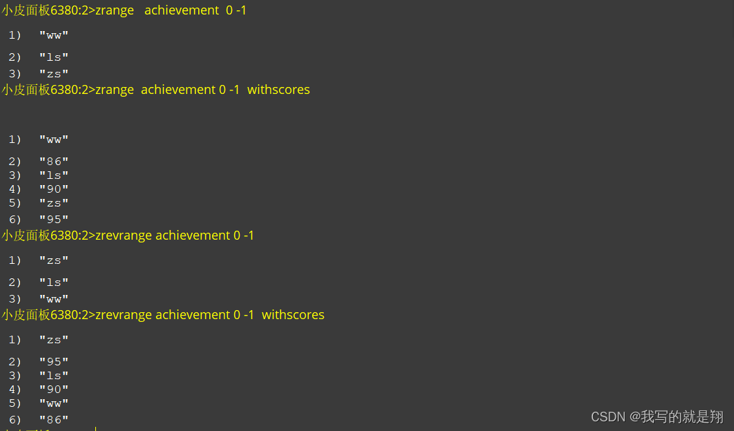 数组回复:一个列表,列表里面包含了有序集合在指定范围内的成员。