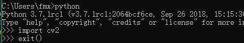 4、测试一下,cmd 进入python,输入import cv2回车,不报错就说明安装配置成功了 。