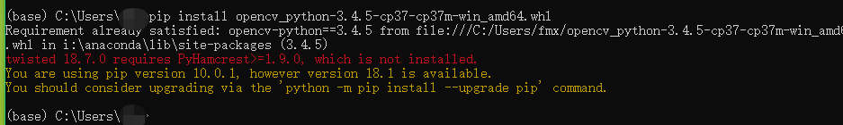 3、执行命令:pip install opencv_python-3.4.5-cp35-cp35m-win_amd64.whl