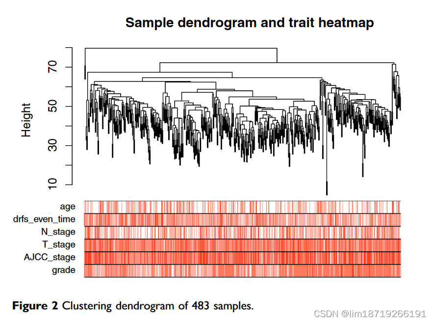 - 画个图:样本聚类树状图(dendrogram)和性状热图(traitheatmap),展示了样本聚类和临床特征之间的关系。
