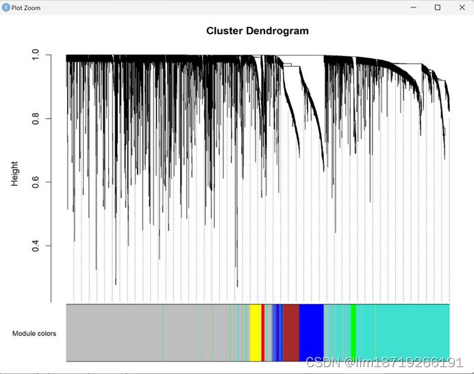 接下来,我们进行了层次聚类以识别模块,每个模块至少包含30个基因( min模体尺寸= 30 )。最后,计算特征基因,对模块进行层次聚类,合并相似模块( abline = 0.25)。