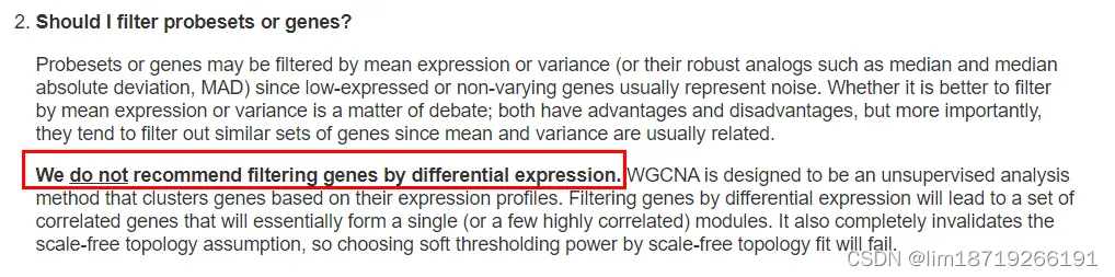 首先,WGCNA并不适合在2.1的差异基因筛选后的基因集上做,原因在知乎上有大佬们进行过讨论: