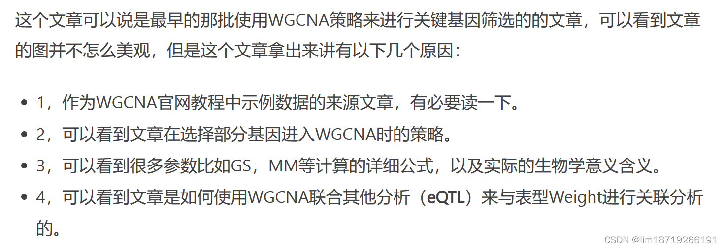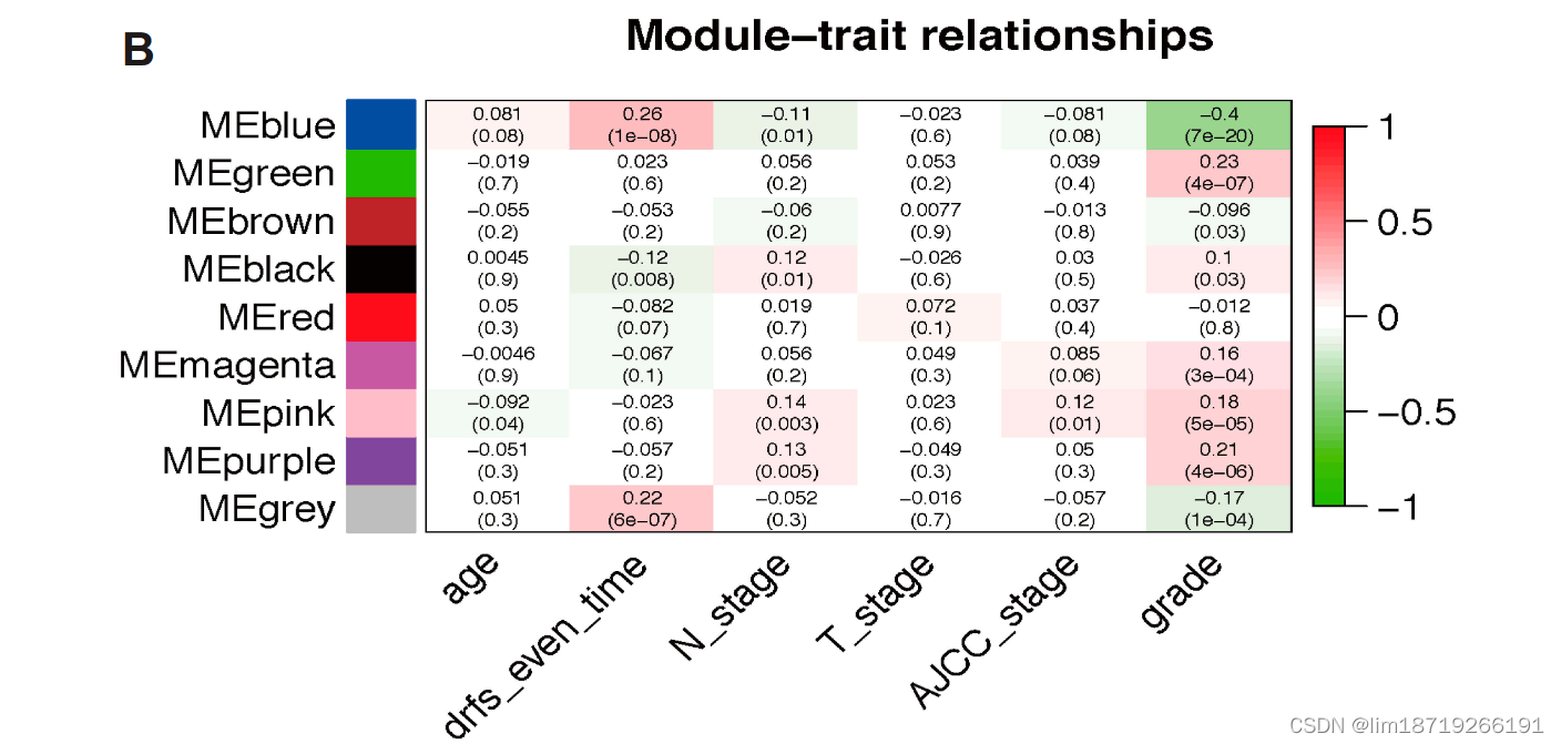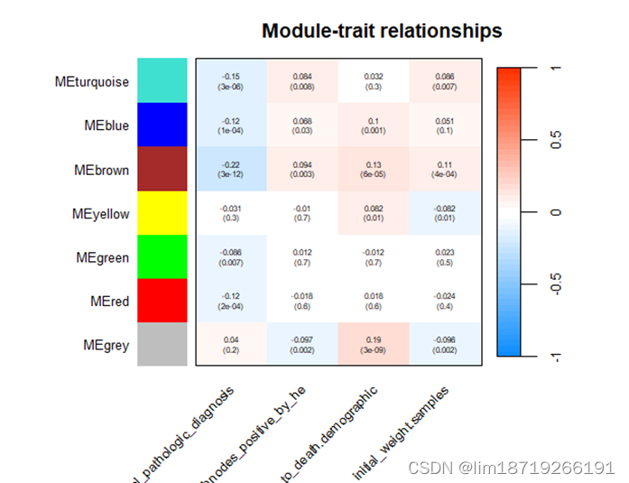 - 总的来说,就是为了将表型特征信息与共表达网络联合起来,比如体重与哪个模块高度相关。