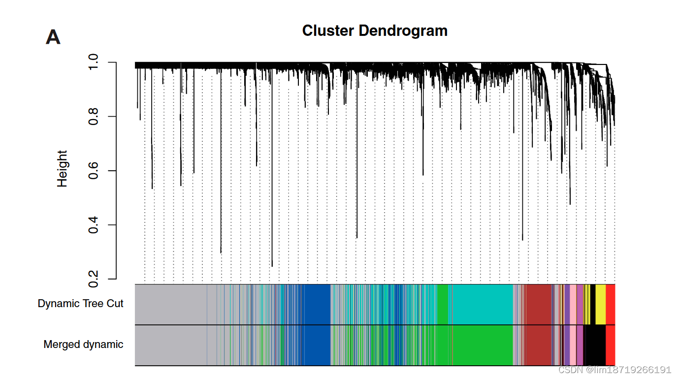 ( A )所有差异表达基因的树状图基于相异性度量( 1-TOM )进行聚类。颜色波段显示了自动单块分析得到的结果。