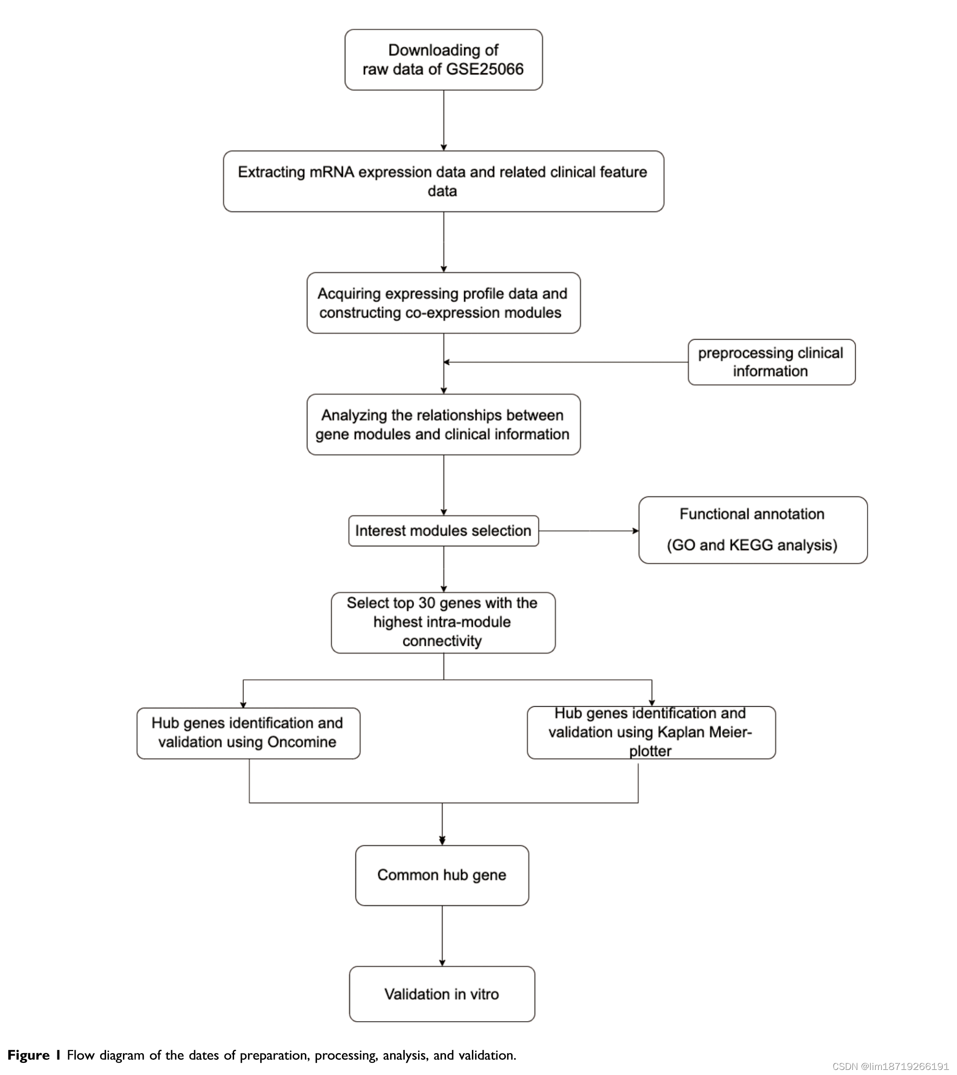 - The intramodule connectivity of a gene is equal to the sum of the degree of correlation between this gene and other genes in that module. The top 30 genes with the highest intramodule connectivity were selected as hub genes. Next, we used the Oncomine database (https://www.oncomine.org/resource/ main.html) to verify the expression, and the Kaplan-Meier plotter website (http://kmplot.com/analysis)forverification of the survival analysis to ensure the reliability of the results.”