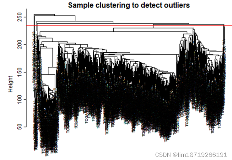 - 提出离群样本:使用层次聚类的方法,将明显离群的树切除(这里设定的高度是235)