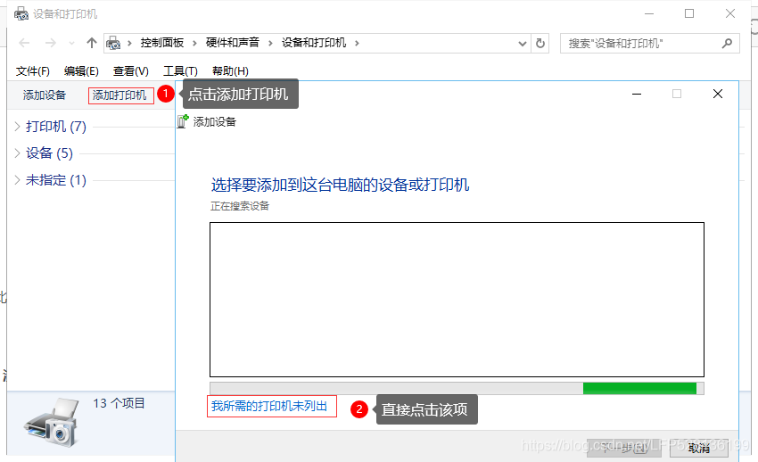 注意:此步操作是在局域网内的其他需要连接共享打印机的计算机上进行的。首先进入设备和打印机列表,点击添加打印机,再点击“我所需的打印机未列出”