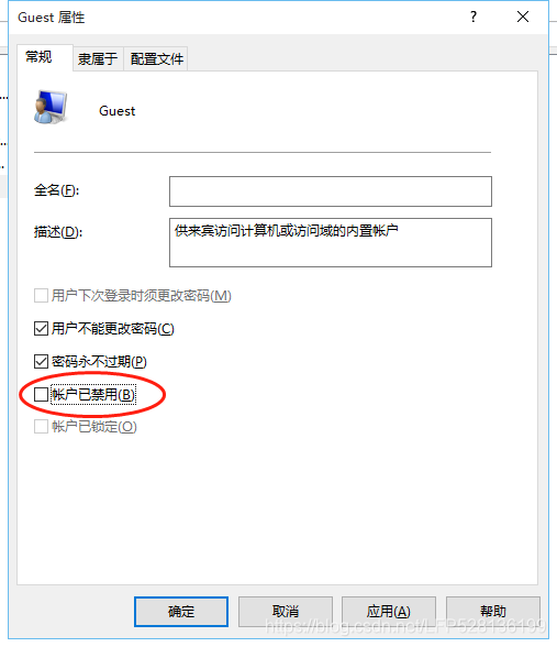 双击【Guest】,打开【Guest属性】窗口,确保【账户已禁用】选项没有被勾选