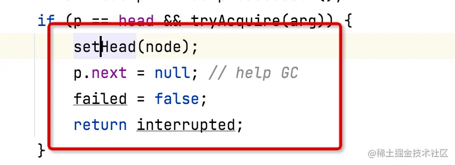 - acquireQueued方法会将当前线程阻塞
