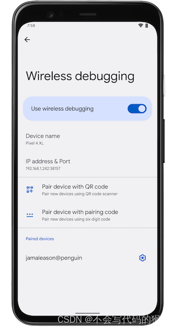 图 3. Google Pixel 手机上的 Wireless debugging 设置。