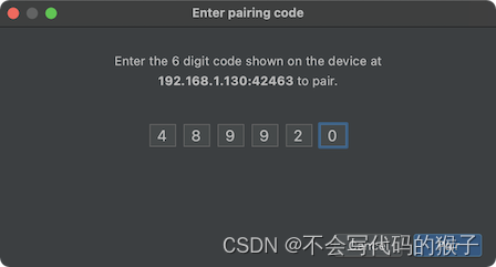 - 如需使用配对码配对设备,请从 Pair new devices over Wi-Fi 对话框中选择 Pair device with pairinging code。在您的设备上,选择 Pair using pairing code。系统会显示一个 6 位数的配对码。当您的设备显示在 Pair devices over Wi-Fi 窗口中后,请输入设备上显示的 6 位数配对码并选择 Pair。