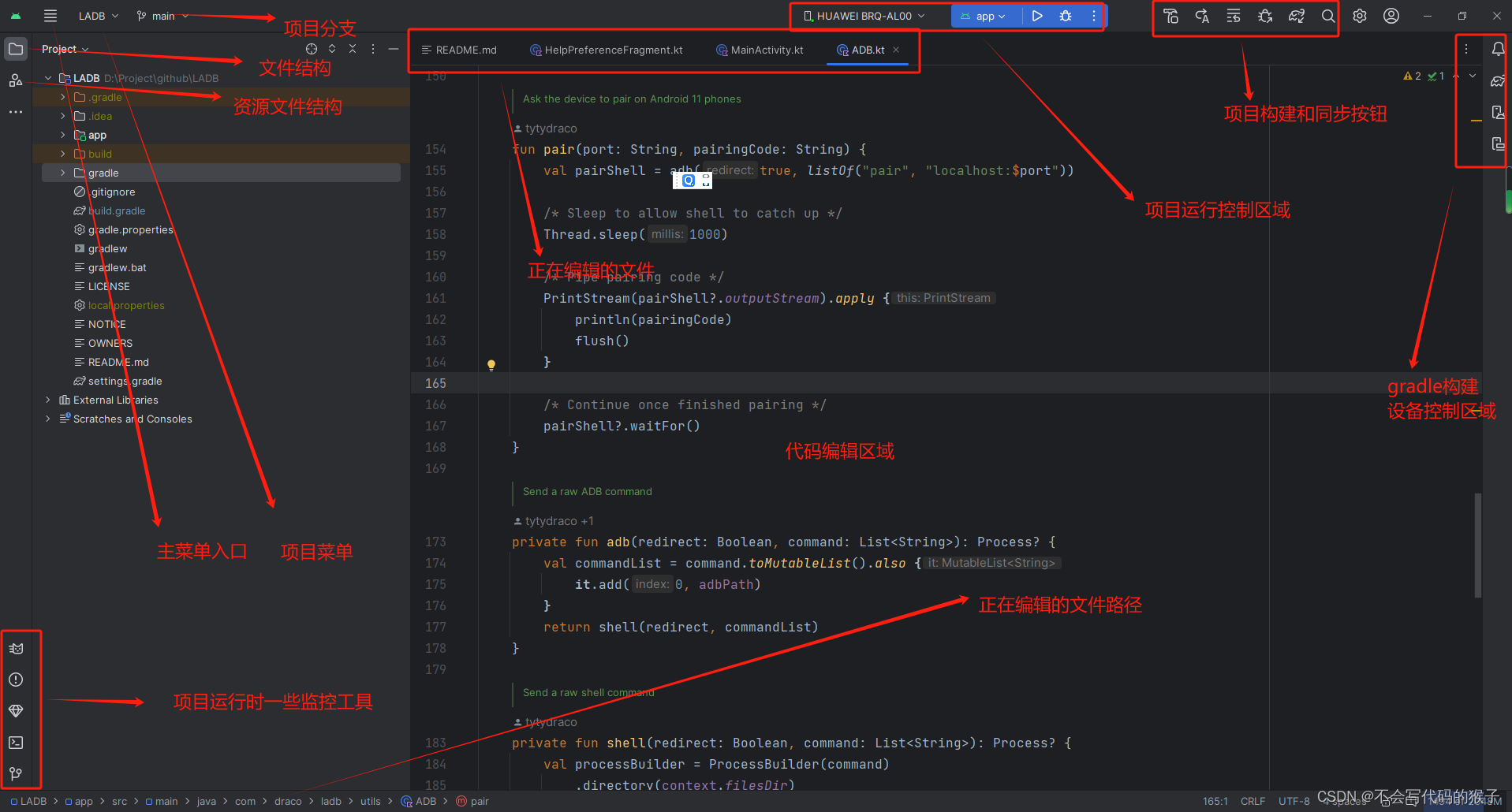 下方主要是项目运行时的监听视窗(包括logcat,debug,git,run)