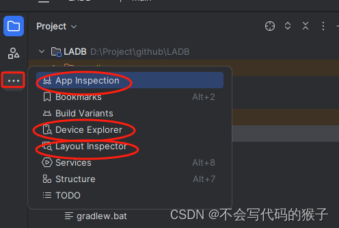 三个点展示的功能中,包含了旧版本下方的Layout Inspector、App Inspection 以及旧版本右侧的Device Explorer几个主要功能。