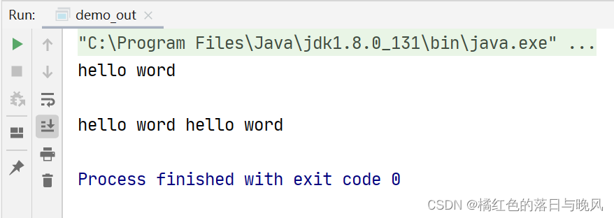 public class demo_out:这是这个 Java 文件的主体,public 是权限修饰符(后续会解释权限修饰符),class 代表这是一个类,demo_out 是类名,创建文件时自定义名称,{}后便是这个 Java 文件的主要内容了,代码将全部在这里面进行编写。