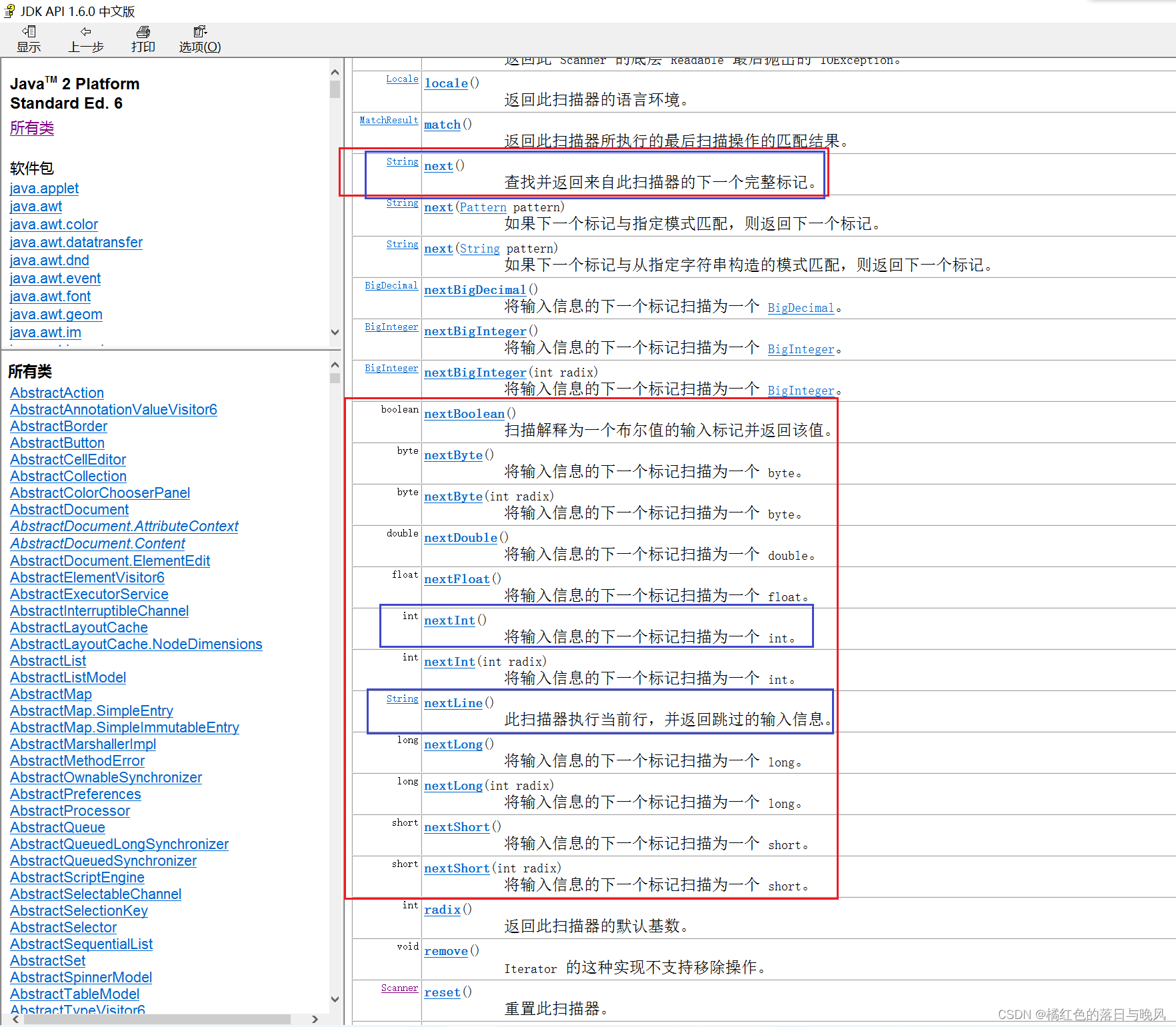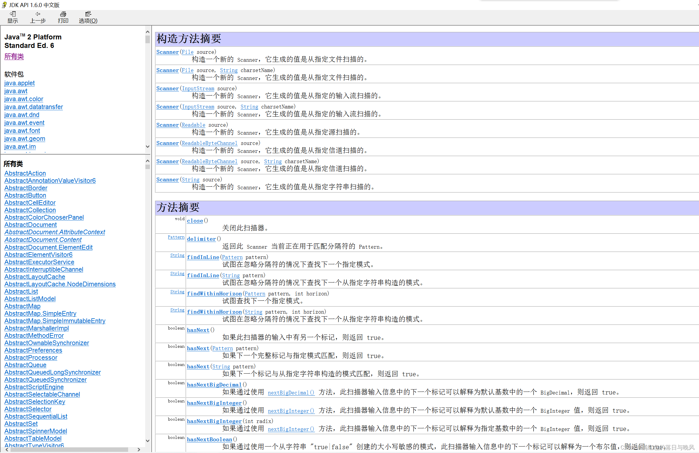 这就是 jdk api 文档中的查询到的 scanner 类的方法和构造函数(构造函数在后续讲解,这里知道有这么个东西即可)。