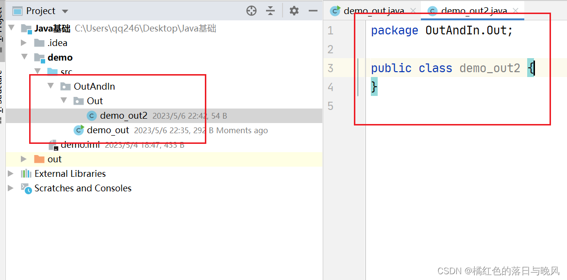 package OutAndIn:package 是包的意思,表明,这个 Java 文件位于 OutAndIn 这个包下(如图一),如果是多级目录的话,则会用( . )连接起来(如图二)