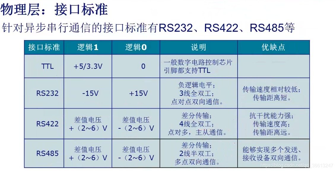 总结:物理层(差分两个线相加决定逻辑,P为高则是高逻辑;232电平和逻辑相反,TTL则相同)
