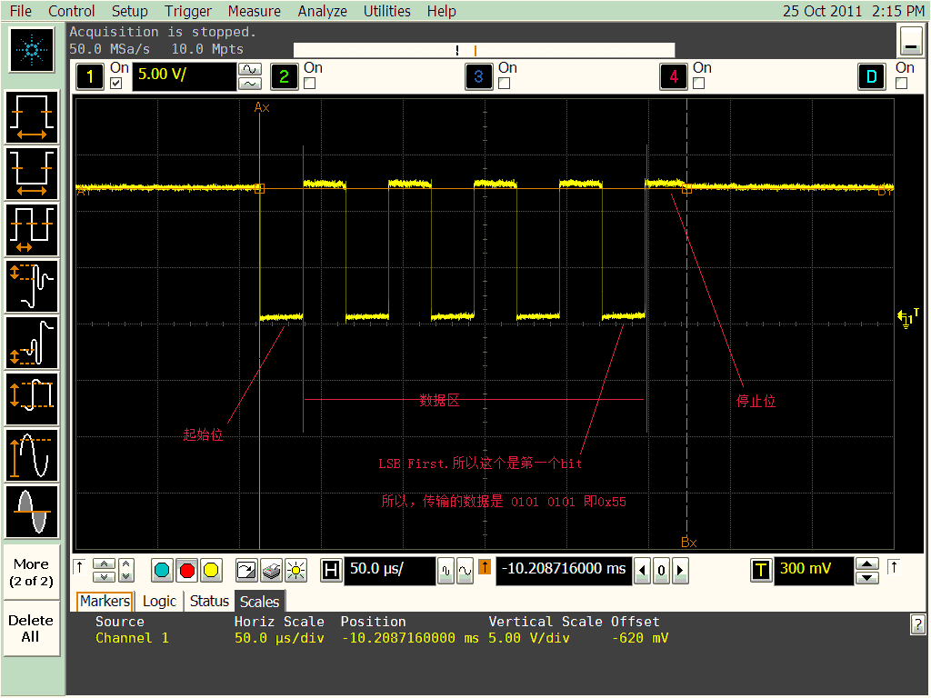 当通讯不正常,又能观察到波形时,就可根据上述方法,从波形图计算一下波特率是否正确。
