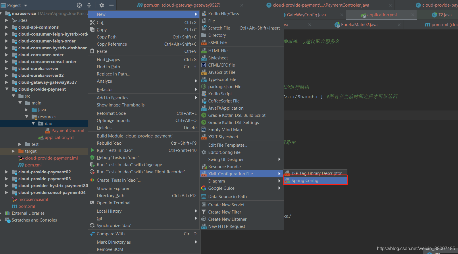 在resources\dao\文件夹下新建PaymentDao.xml文件,与PaymentDao映射,这里注意新建要新建spring的可识别的配置的xml文件,不会报错说找不到方法。如下图: