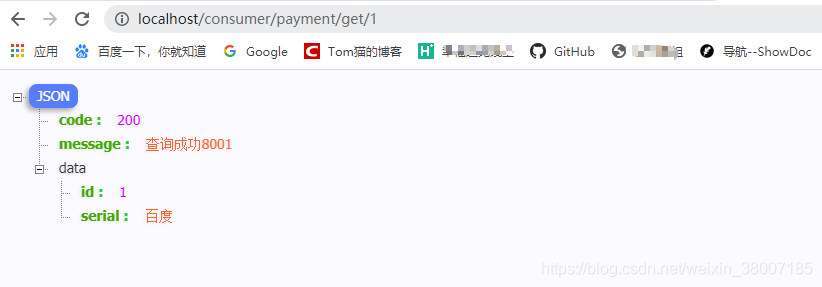 我们消费者的端口配置为80,访问就可以省略端口,直接输入:http://localhost/consumer/payment/get/1访问。成功获取到id为1的支付订单。
