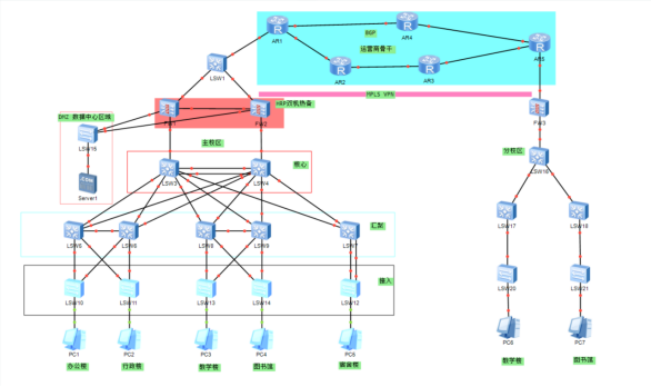 划分:教学楼区域、宿舍区域、办公楼区域、行政楼区域,图书馆区域、数据中心。并且设有web服务器。出口设置双机热备技术,与互联相连,并设置NAT。
