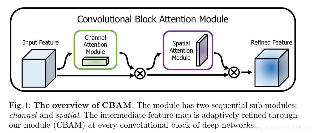 文章中提出的CBAM注意力模块由通道注意力模块和空间注意力模块串行连接组成,CBAM从通道和空间两个维度计算feature map的attention map,然后将attention map与输入的feature map相乘来进行特征的自适应学习。文章中也尝试了进行并行连接,发现串行连接的方式能够取得更好的效果。