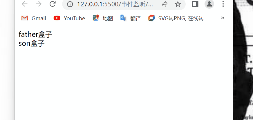 如下图所示,因为子元素以及父元素在设置监听事件时均设置的是在事件的冒泡阶段调用回调函数,单击子元素时,因为事件的冒泡此单击事件会一直冒泡到父元素中。