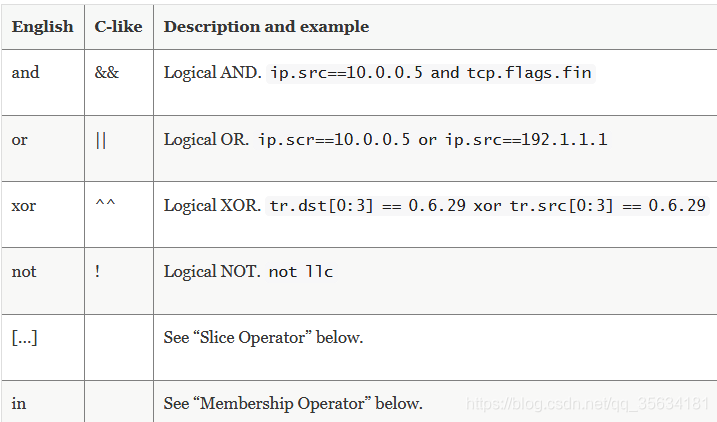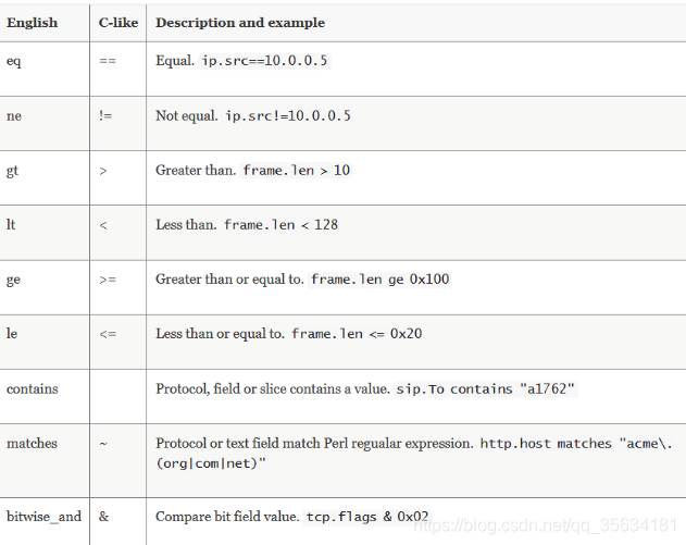 过滤关系就是大于、小于、等于等几种等式关系,我们可以直接看官方给出的表。注意其中有“English”和“C-like”两个字段,这个意思是说“English”和“C-like”这两种写法在wireshark中是等价的、都是可用的。